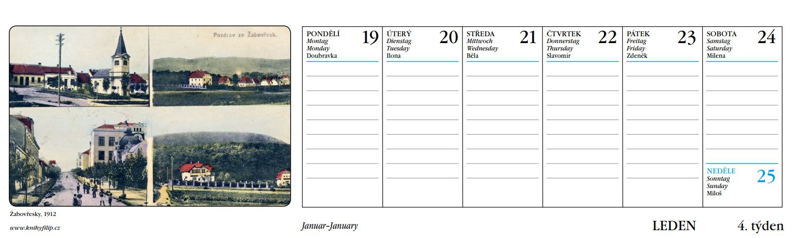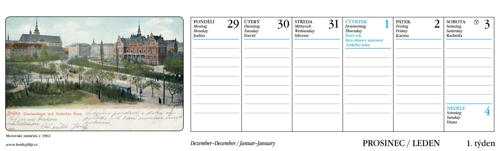 Stolní kalendář již tradičně obsahuje historické pohlednice města Brna ze sbírky Ing. Vladimíra Filipa, které vás zavedou na cestu časem a umožní vám nahlédnout do historie a krás tohoto moravského města. Každý týden vás potěší inspirativními pohlednicemi, které vám dodají pozitivní energii po celý rok. Můžeme sledovat vývoj architektury, zmizelé budovy, které nahradily nové stavby, nebo jak se měnily veřejné prostory jako náměstí, parky a ulice. Vidíme, jak lidé dříve trávili svůj volný čas, jaké oděvy nosili a jaké dopravní prostředky používali. Historické pohlednice nám pomáhají lépe porozumět našim kořenům, ocenit proměny, kterými prošlo naše město a společnost, a vážit si dědictví, které nám